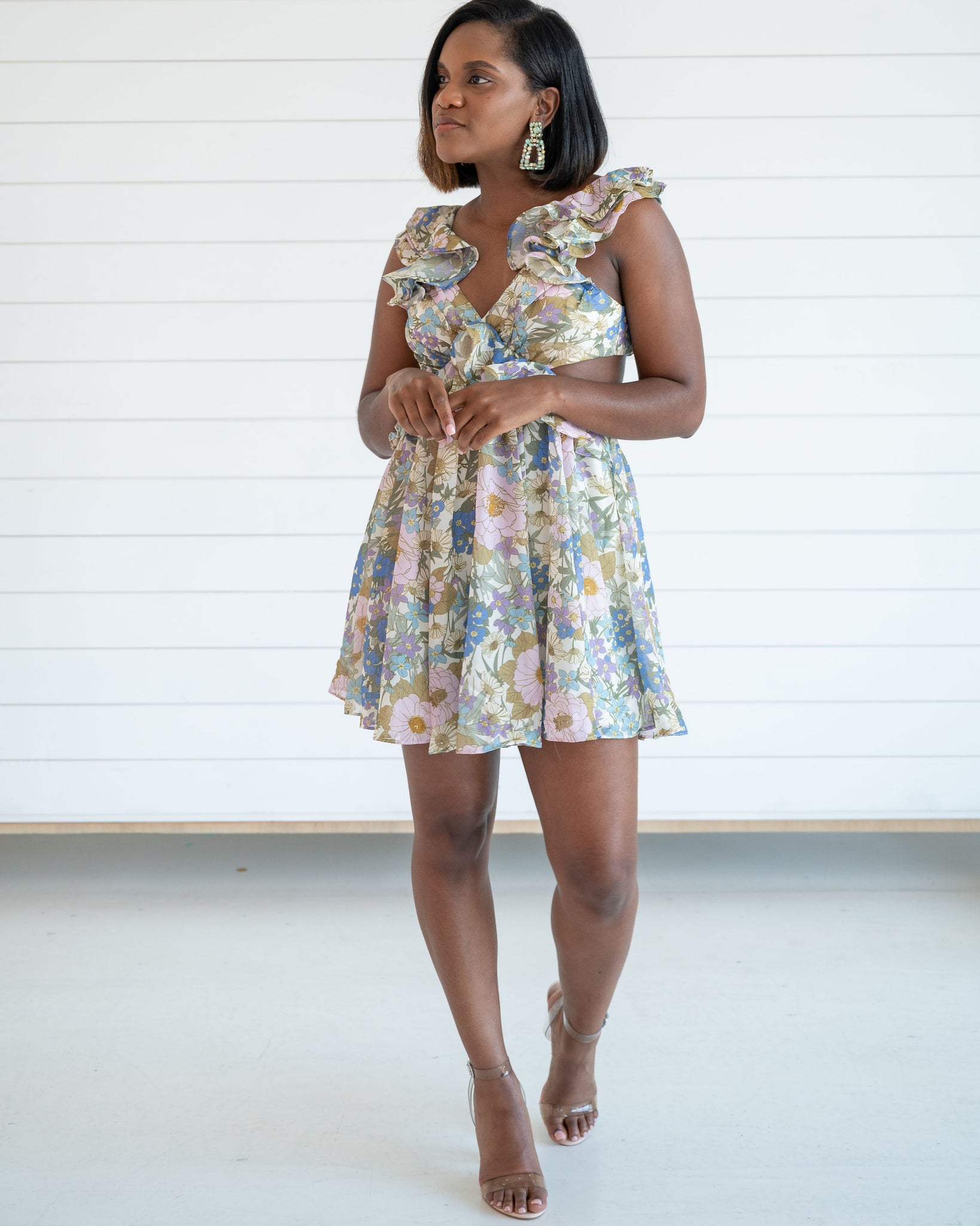 Ruffle shoulder dress with back tie